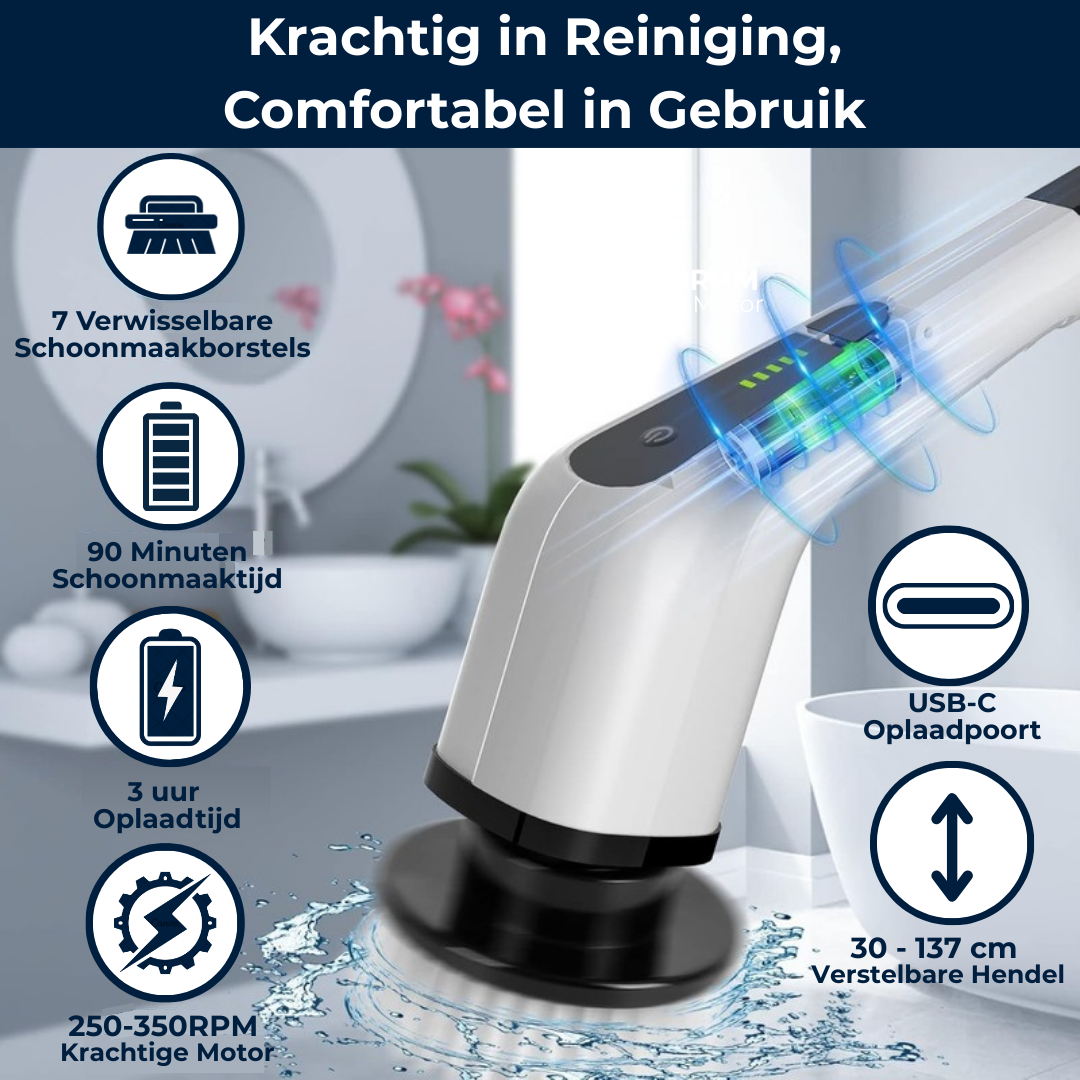 Ik ben echt onder de indruk van deze spinscrubber! De verschillende opzetborstels maken het super makkelijk om zowel de badkamertegels als de vloer grondig schoon te maken. En heel fijn dat ik de steel kan verstellen. Geen rugpijn meer na het schoonmaken. Ik raad dit iedereen aan die een snellere en makkelijkere manier zoekt om schoon te maken!